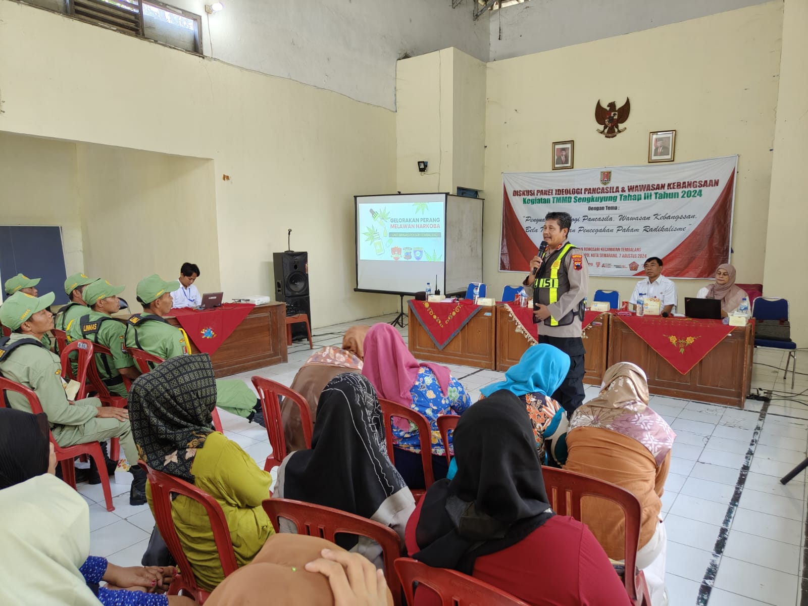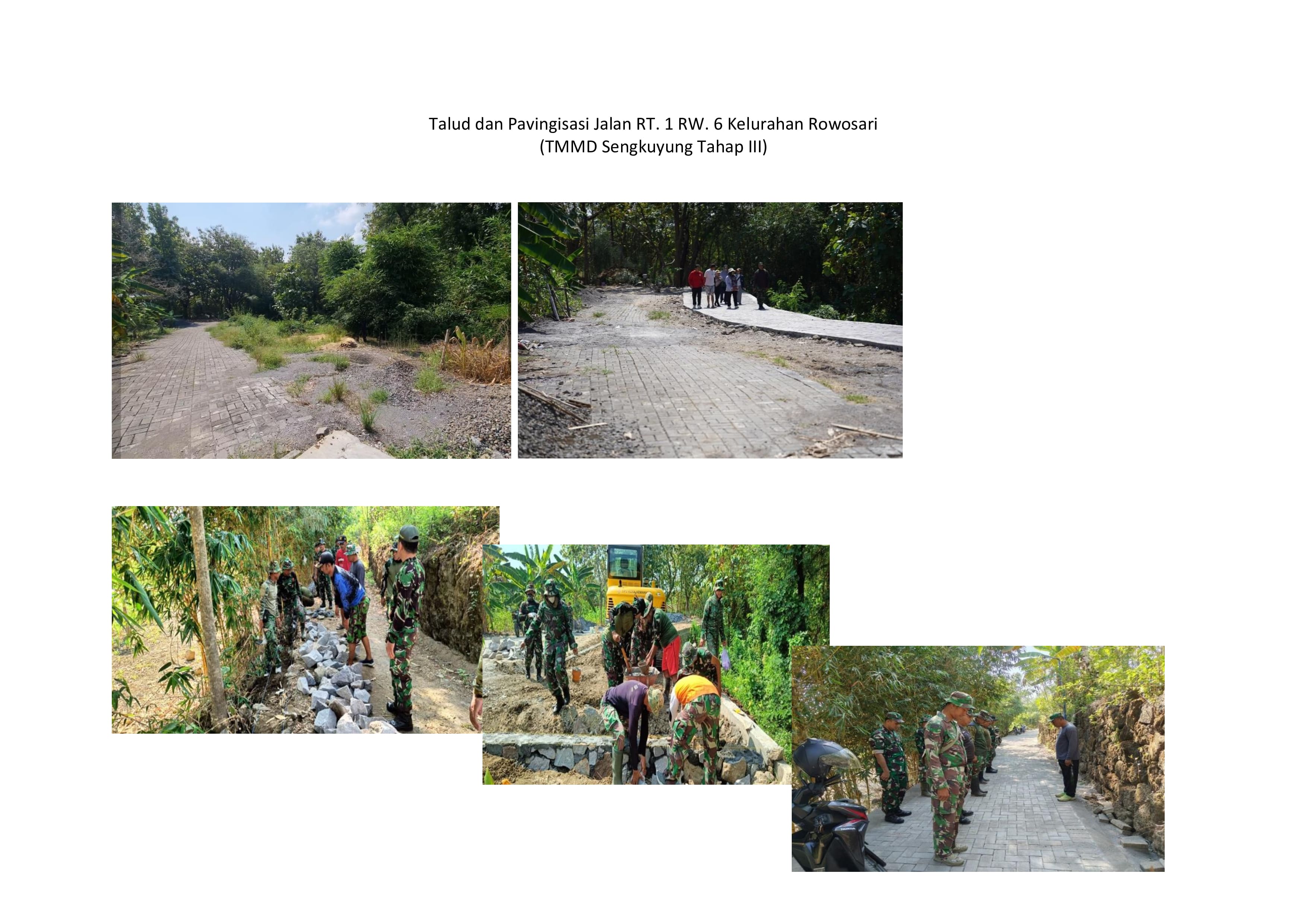 TMMD SENGKUYUNG TAHAP III Tahun 2024 di laksanakan berdasarkan surat Sekretaris Daerah Provinsi Jawa Tengah Nomor 000/159 tanggal 3 Juli 2024 perihal Pelaksanaan TMMD Reguler ke-121 dan Sengkuyung Tahap III TA 2024. Pelaksanaan pembukaan tanggal 24 Juli 2024 dan penutupan tanggal 22 Agustus 2024 ditandai dengan penandatanganan Naskah Serah Terima Program TMMD Sengkuyung III oleh Komandan Kodim selaku Dansatgas TMMD dan Walikota di Kelurahan Rowosari Kecamatan Tembalang Kota Semarang. Pada TMMD Sengkuyung Tahap III Tahun 2024 dilaksanakan kegiatan fisik dan non fisik. Sumber anggaran kegiatan fisik bersumber dari Bantuan Keuangan APBD Provinsi Jawa Tengah dan APBD Kota Semarang serta dukungan CSR dari BAZNAS dan PDAM Kota Semarang. Secara umum sasaran fisik TMMD Sengkuyung Tahap III TA. 2024 yang dilaksanakan di wilayah Kodim 0733 Kota Semarang yaitu Kelurahan Rowosari Kecamatan Tembalang telah selesai dilaksanakan 100% sesuai dengan waktu yang telah ditentukan. Sebelum pelaksanaan TMMD terlebih dahulu dilaksanakan kegiatan Pra TMMD dengan kegiatan pembersihan jalan yang menjadi sasaran pembuatan talud, pavingisasi dan betonisasi jalan, pemugaran rumah yang menjadi sasaran RTLH, penyiapan lokasi posko TMMD serta sarana prasarana yang dibutuhkan dalam pelaksanaan kegiatan TMMD Sengkuyung Tahap III TA. 2024. Adapun rincian sasaran fisik sebagai berikut : • Betonisasi Jalan RT. 1 RW. 6 (Bankeu Provinsi) : 96m3 • Pavingisasi Jalan RT. 1 RW. 6 (APBD Kota Semarang) : 97 x 3 m • Pembangunan Talud RT. 1 RW. 4 (APBD Kota Semarang) : 0.3 x 0.4 x 2 x 97 m • Rehab Rumah Tidak Layak Huni (BAZNAS Kota Semarang) : 15 Unit • Pembangungan Tandon Air Bersih (PDAM) : 1 paket Selain kegiatan fisik juga diselenggarakan kegiatan non fisik yang dilaksanakan oleh OPD/instansi pendukung di lingkungan Pemerintah Kota Semarang.